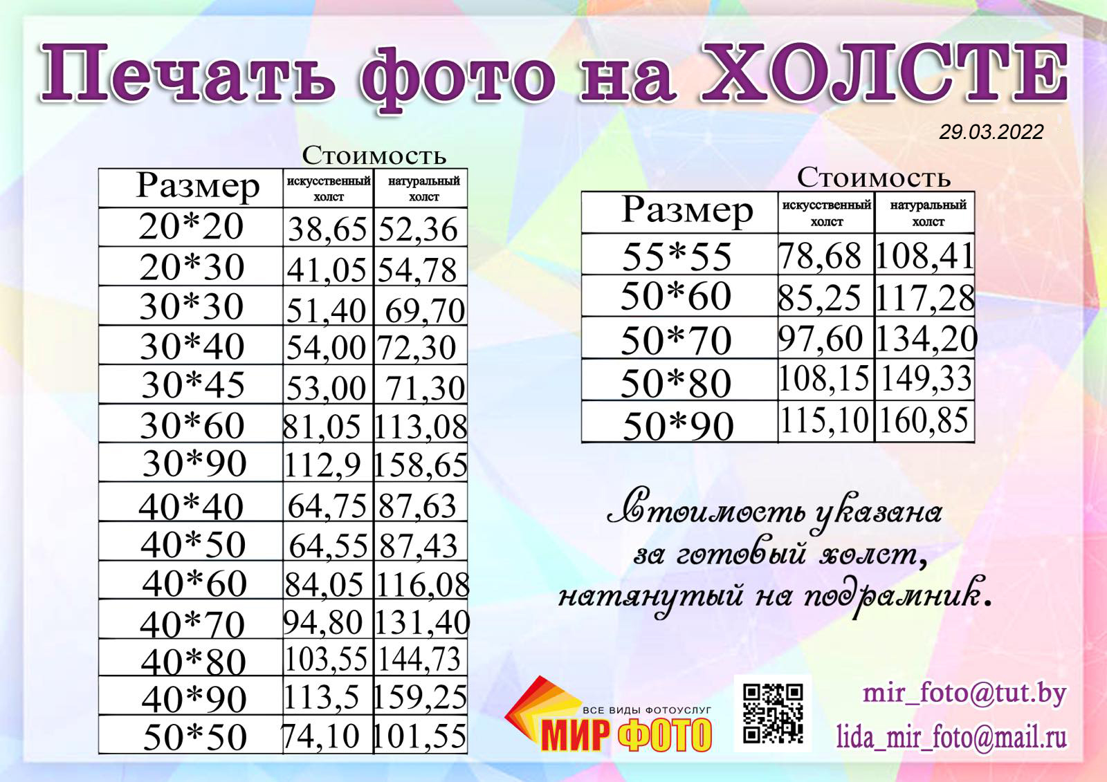 Размеры подрамников. 20х20, 20х30, 25х21, 26.7х21, 30х30, 30х40, 30х45, 30х50, 30х55, 30х60, 30х90, 32.5х45.2, 35х55, 40х40, 40х50, 40х60, 40х70, 40х80, 40х90, 50х50, 50х60, 50х70, 50х80, 50х90, 55х35, 55х55, 55х75, 60х70, 60х90 см.