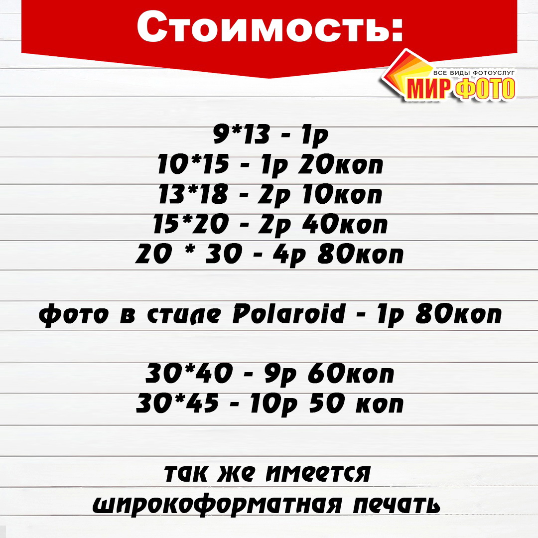 Печать осуществляетка с любых цифровых носителей, цифровых гаджетов, фотоаппаратов, смартфонов. Передача файлов с Ваших гаджетов возможна через "ИНТЕРНЕТ", а так же на наш фотокиоск через "БЛЮТУЗ" или USB подключение. Актуальность прайса уточняите у менеджера на момент заказа услуги.