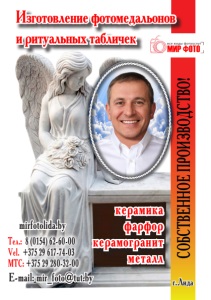 Тел.: 8 (0154) 62-60-00 Vel. +375 29 617-74-03 МТС: +375 29 280-32-00 г. Лида E-mail: mir_foto@tut.by Изготовление фотомедальонов и ритуальных табличек керамика фарфор керамогранит металл СОБСТВЕННОЕ ПРОИЗВОДСТВО! mirfotolida.by